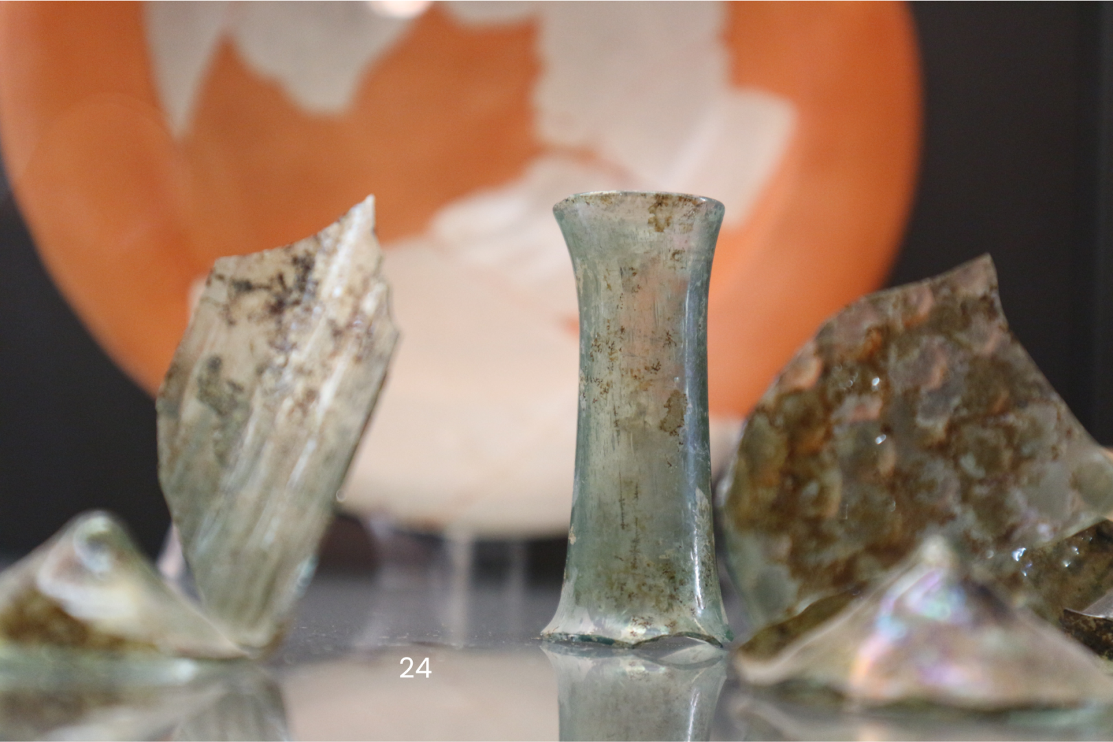 24 Frammenti di recipienti in vetro tra i quali fondi di bicchiere, utilizzati per bere il vino