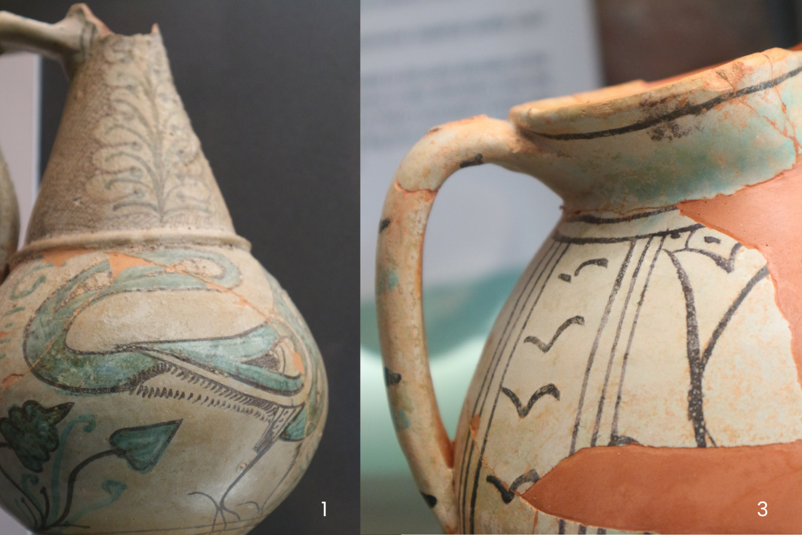 3 Boccale in maiolica arcaica decorato con motivo vegetale, utilizzato per versare il vino